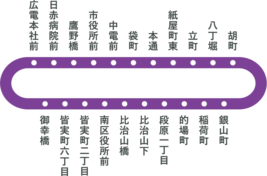 循環線は、広電本社前〜市役所前〜紙屋町東〜八丁堀〜稲荷町〜的場町〜段原一丁目〜皆実町六丁目などの各電停を循環する路線です。広島に住む方、観光で訪れる方の利便性はもちろん、都心へのスムーズなアクセスで回遊性の向上を図ります。